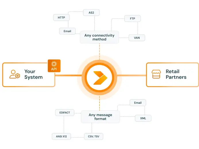 Already have an API? Crossfire seamlessly connects your current systems to new trading partners, cloud services, or third-party applications, regardless of format or business case. We handle translation between EDI, API, and other data types, so you can automate workflows and scale integrations without complexity or risk.